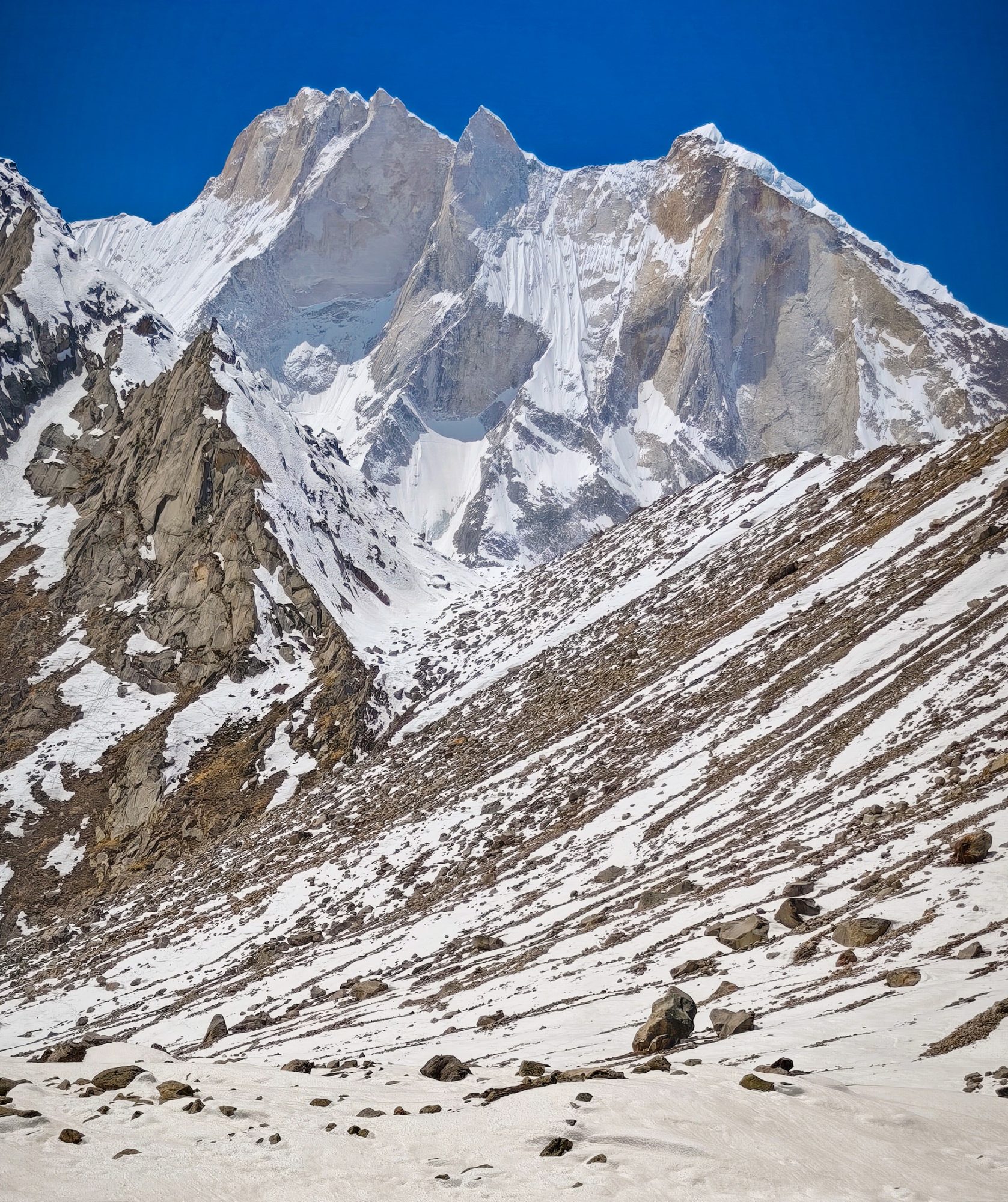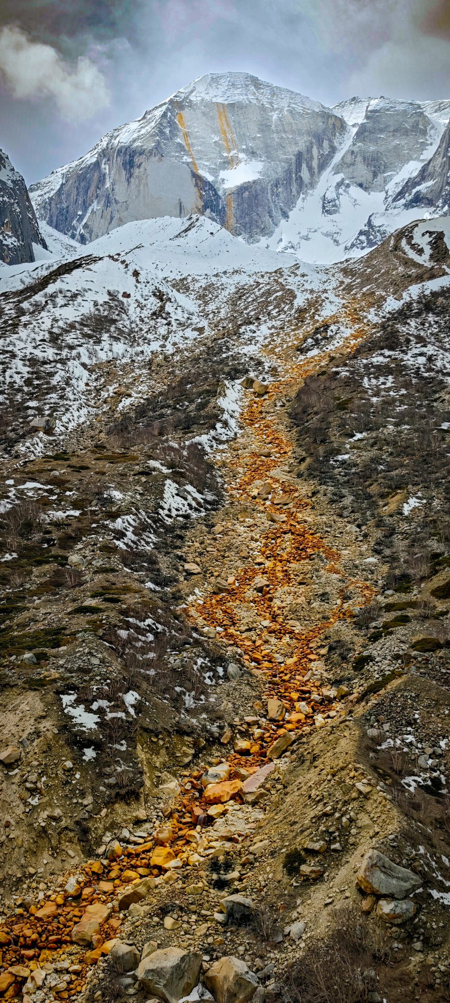 The difficulty was magnified exponentially by the frozen terrain. Gauging each step felt like negotiating with fate—never knowing if the foot would find purchase or slip into the void. This was the ultimate test of Adrenal Glands – Pumping in a primal rhythm as we navigated the “shooting stone” zones; VO2 Max: Lungs screaming for oxygen, pushing the limits of human endurance; Leg Muscles: Trembling under the weight of the ascent, burning with the fire of effort.
